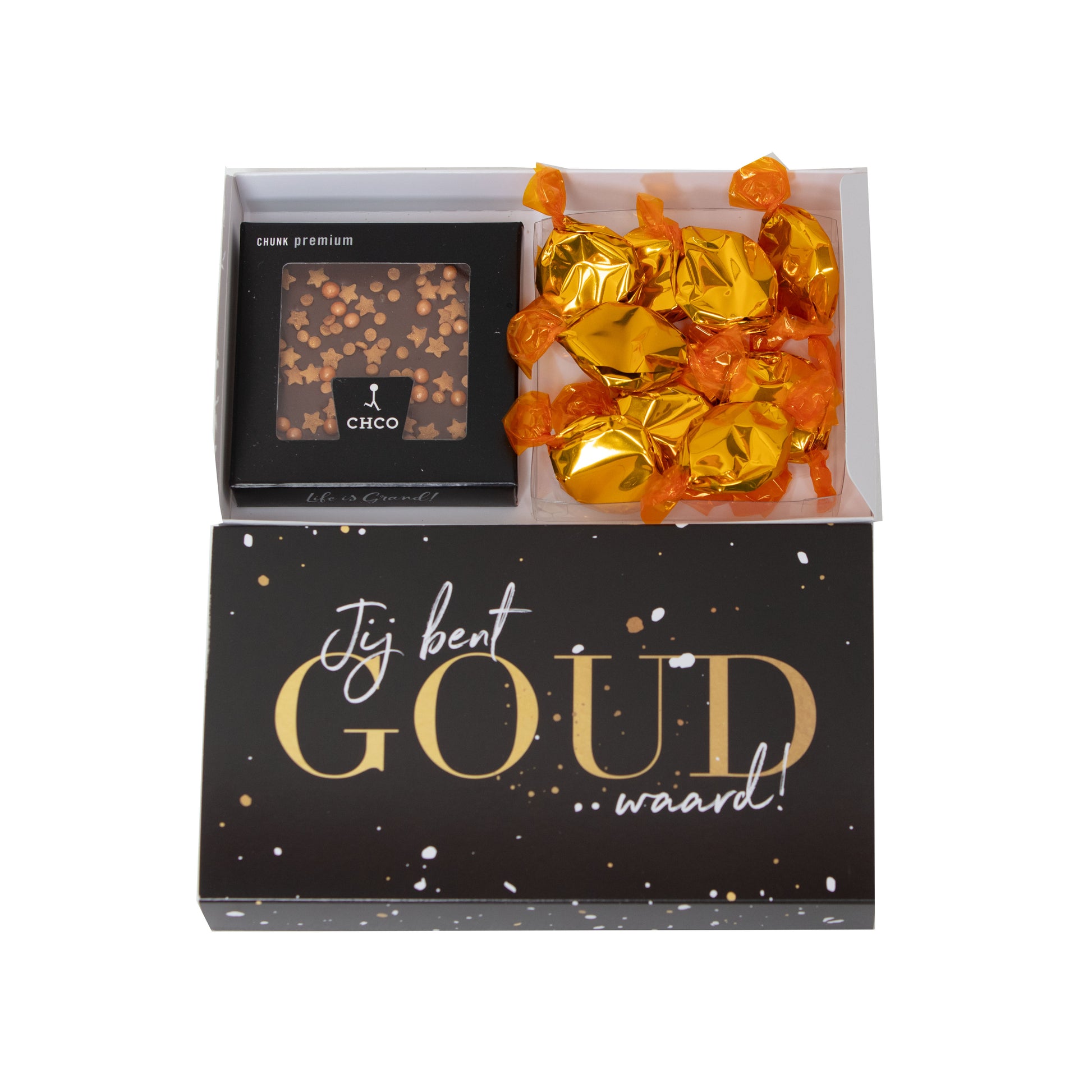 Verras een speciaal iemand met het Jij bent goud waard cadeau van Geschenkgeven.nl. Deze luxueuze box bevat heerlijke gouden lekkernijen die perfect zijn voor het vieren van bijzondere momenten. Een verfijnd geschenk dat zorgt voor een gouden glimlach.