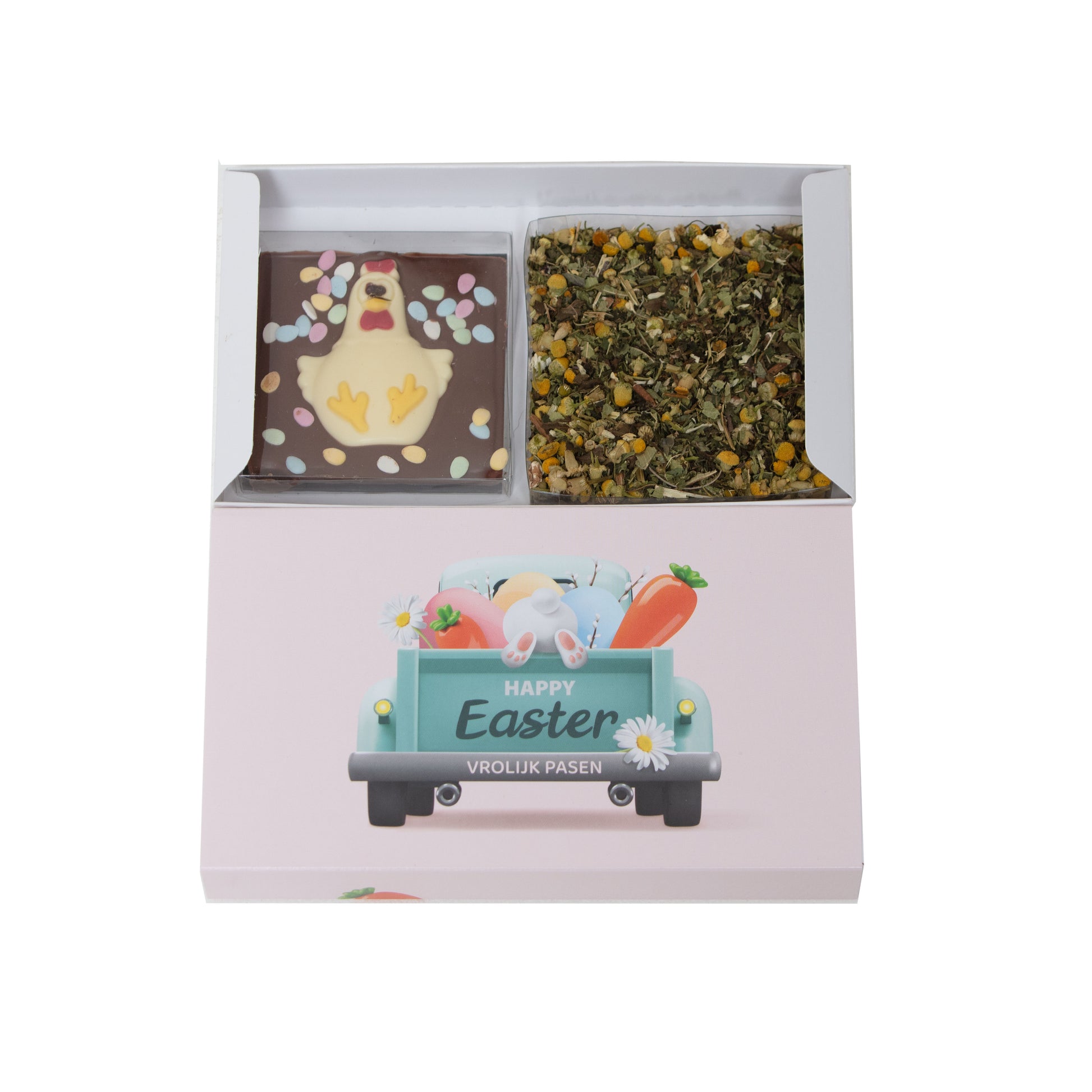 Verpakt in een speelse "Happy Easter – Vrolijk Pasen" box, klaar om direct cadeau te geven.