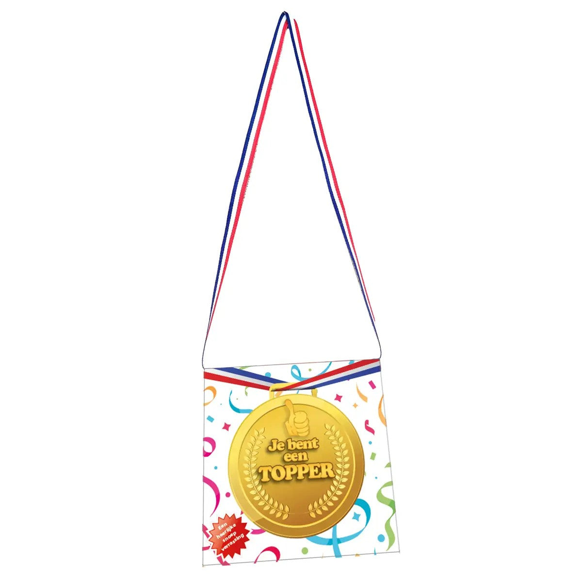 Deze leuke en originele verpakking met als inhoud een lekkere snoep verrassing (met onder andere 2 heerlijke lolly’s, een snoep horloge en een likschelp) is perfect voor iemand die een pluim verdiend heeft. Met het bijgeleverde rood-wit-blauwe lintje kan diegene ook aan iedereen laten zien wat voor een topper hij/zij is.