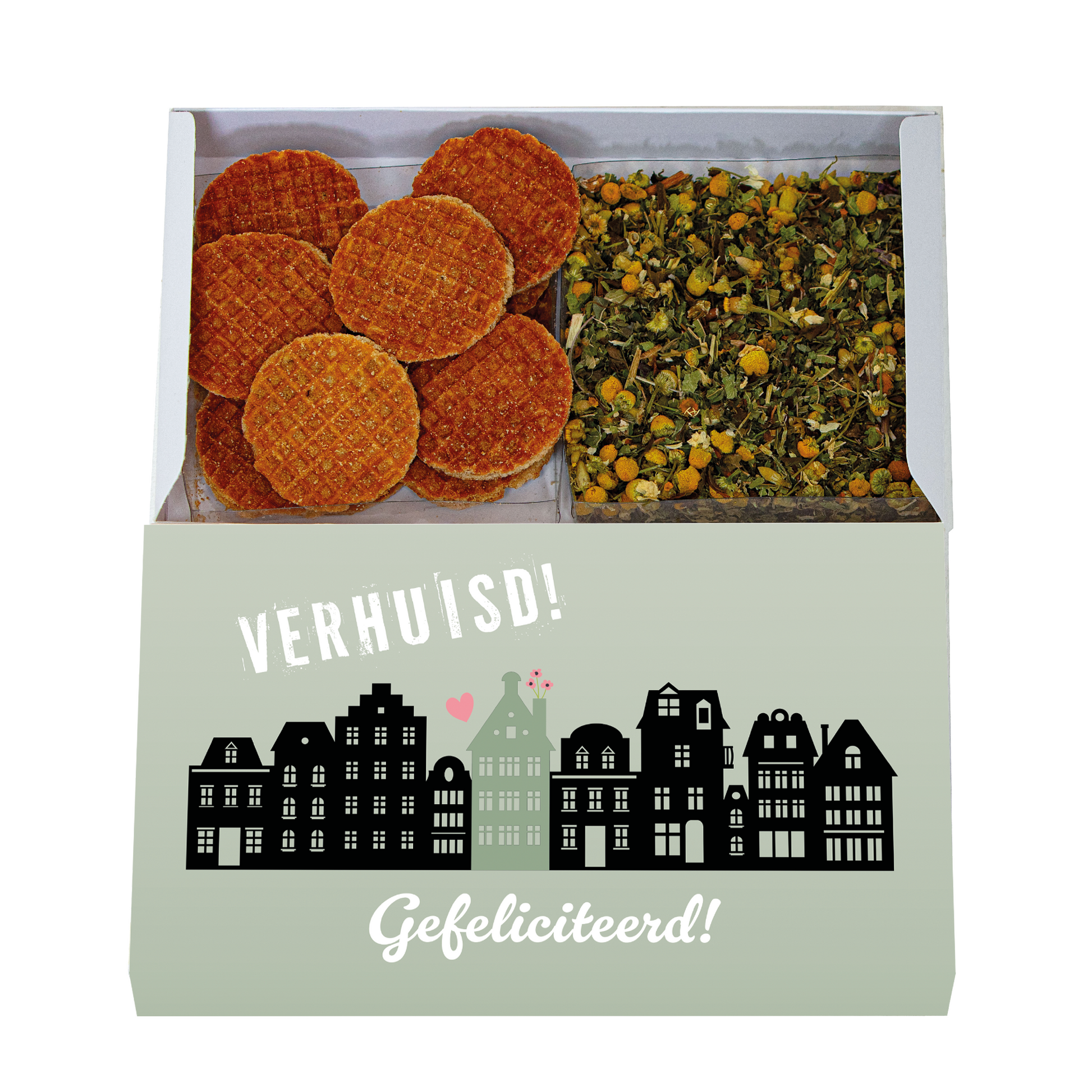 25 gram Gelukskruiden thee, 2 biologisch afbreekbare theefilter zakjes, 100 gram stroopwafels
